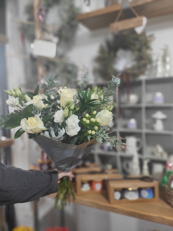This elegant bouquet reflects Christmas but adds a modern touch. With white roses, hypericum and white lisianthus while still incorporating that festive feel with the added spruce and dried whole limes.