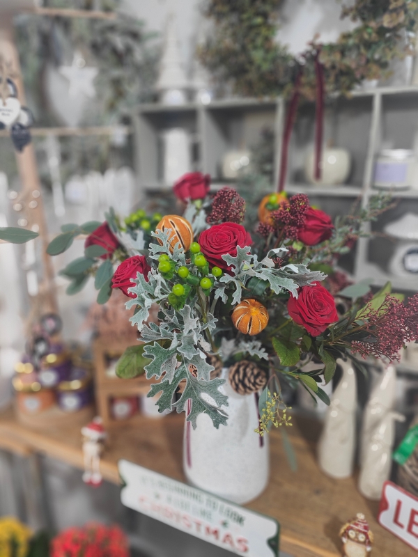 This traditional vase arrangement is a beautiful festive addition to any home, with its mix of Red Roses, Skimmia and pine cones enrobed by festive foliage, its deep colours add warmth over the Christmas period.