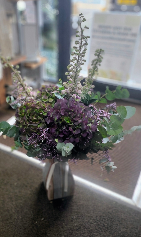 Luxury Hand-tied bouquet of large head purple hydrangea and delphinium finished with lilac limonium and eucalyptus.